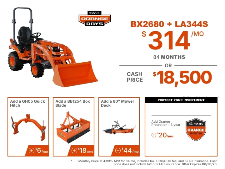 Orange Protection Pricing is for tractor only, would extend factory warranty for 3 additional years. Implement monthly payment pricing factors in KTAC insurance, interest - does not calculate out to cash price. Monthly Price based on 4.99% APR for 84 mo, includes tax, UCC/DOC fee, and KTAC Insurance. Cash price does not include tax or KTAC insurance. Offer Expires 06/30/26.